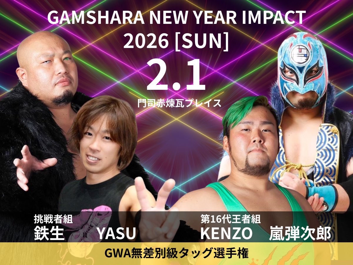 2/1に門司赤煉瓦プレイスで開催される"GAMSHARA NEW YEAR IMPACT 2026"の対戦カードをアップしました。