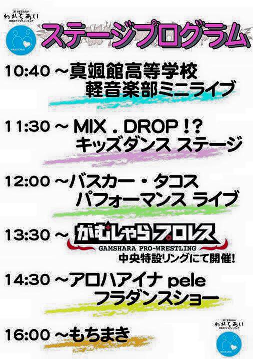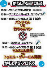時間/12:45~13:00 プロレス教室、13:00~14:00 がむプロ試合、14:15~15:30 おにぎり早食い大会