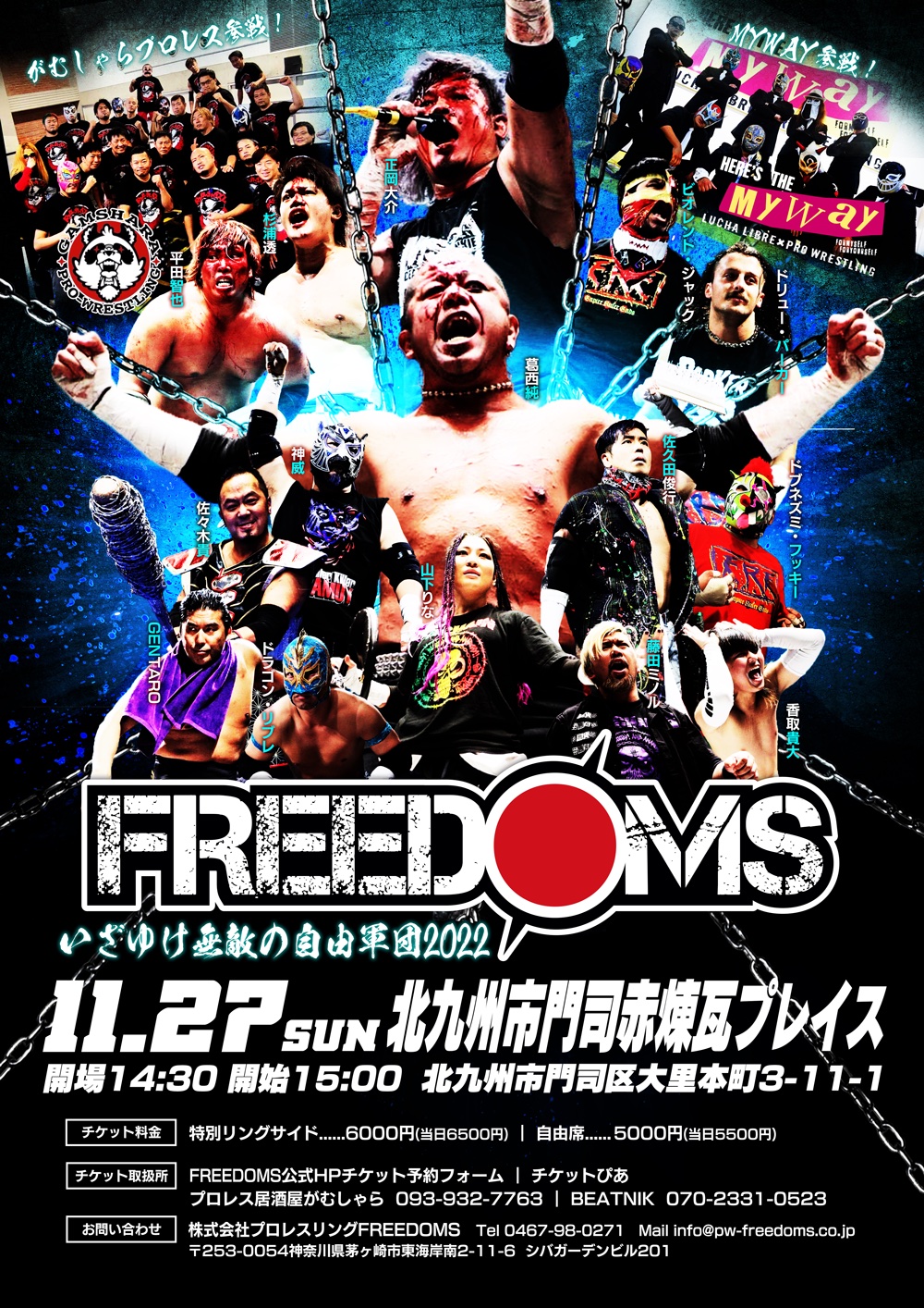 チケットはFREEDOMS公式HPチケット予約フォーム、ちけっとぴあ、またはプロレス居酒屋がむしゃら(093-932-7763)、BEATNIK(070-2331-0523)まで