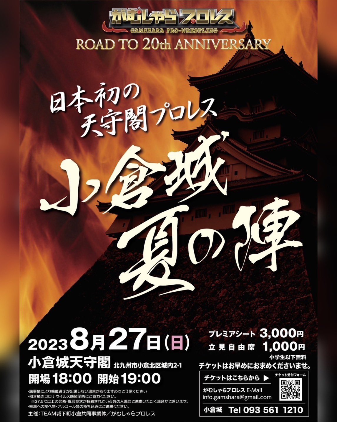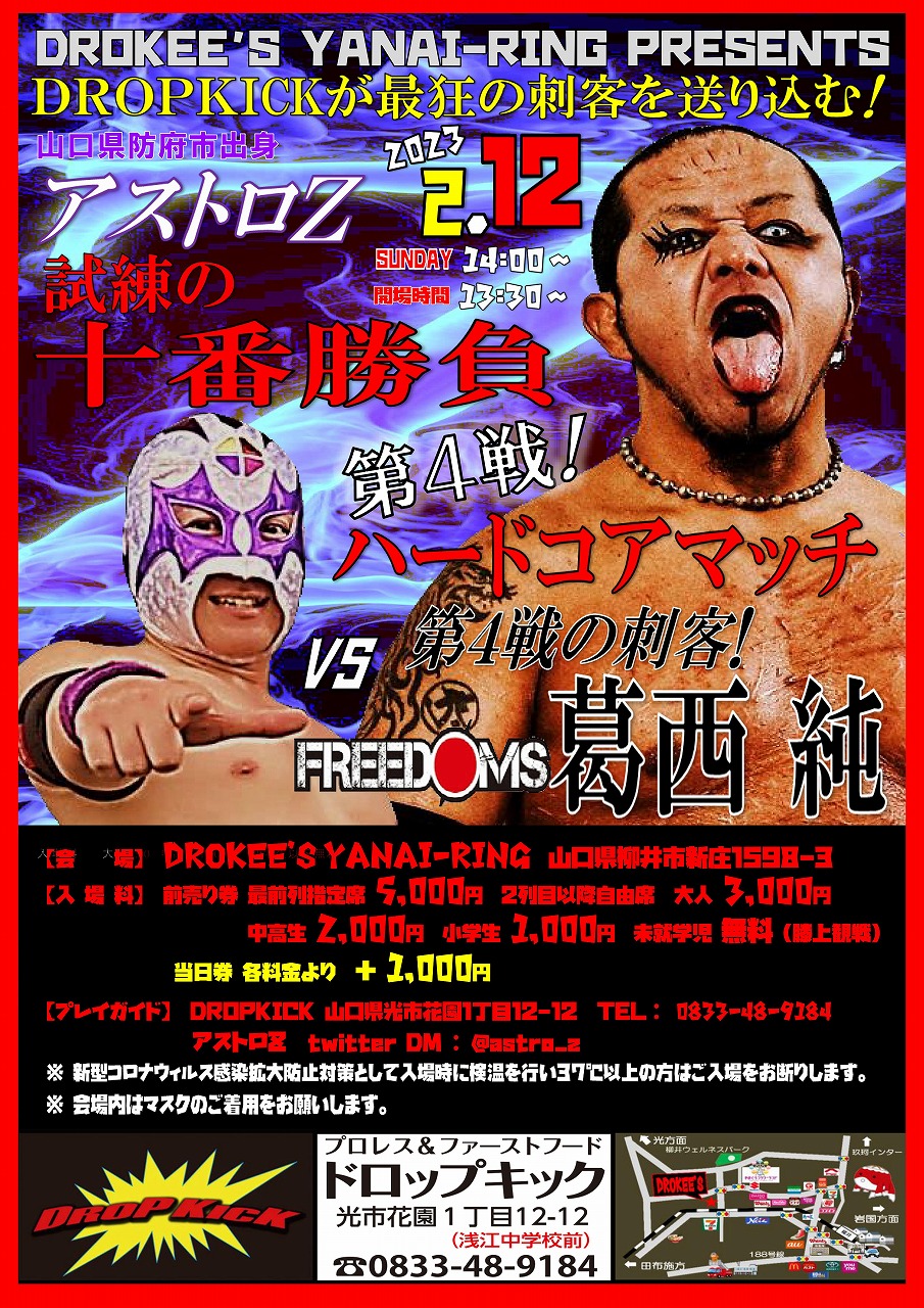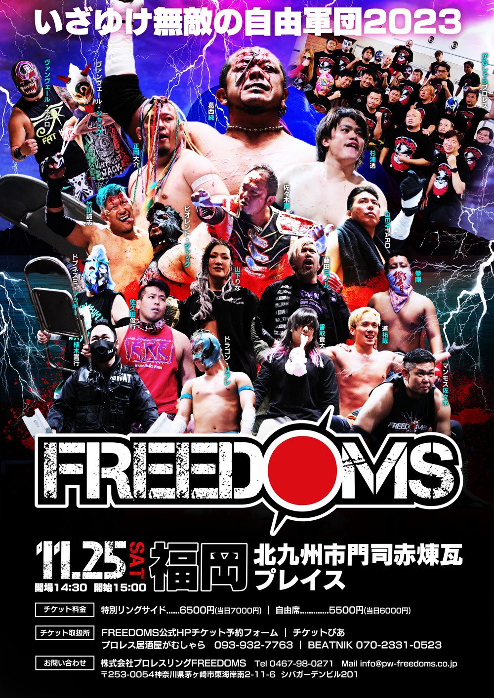 チケットはFREEDOMS公式HPチケット予約フォーム、ちけっとぴあ、またはプロレス居酒屋がむしゃら(093-932-7763)、BEATNIK(070-2331-0523)まで